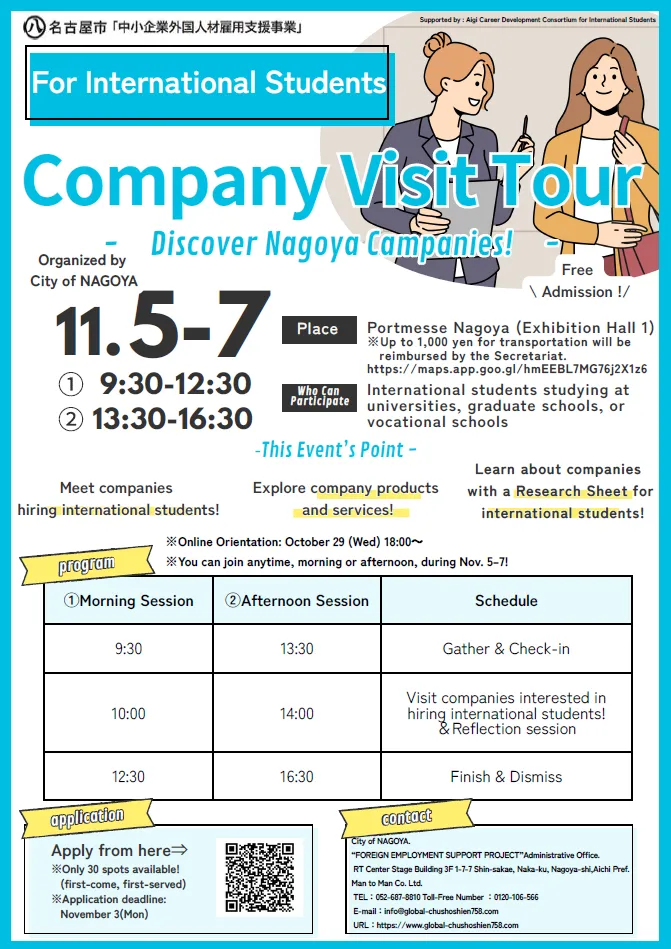 愛知県内には現在、約12,900人の外国人留学生(※)が在籍しており、多くが日本企業での就職を希望しています。一方で、留学生は日本企業の情報収集や就職活動の進め方に戸惑いがあり、企業側も留学生の考えや意欲を知る機会が限られているのが現状です。こうした課題を踏まえ、名古屋市では市内中小企業における外国人材の雇用促進を目的とした本事業を進めており、その一環として「メッセナゴヤ2025」会場内にて外国人留学生のための企業見学ツアーを実施いたします。 本ツアーでは、事務局スタッフの同行のもと、留学生が出展企業ブースを訪問し、人事担当者や社員の方々から企業紹介を受け、質疑応答を通じて理解を深めます。本企画を通じて、外国人留学生と企業の相互理解を促進し、地域における雇用と定着のきっかけづくりを目指します。
