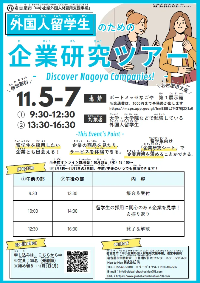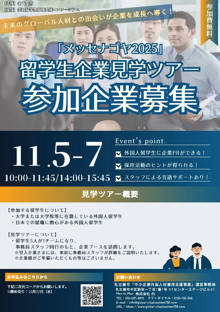 本イベントは、日本最大級の異業種交流展示会「メッセナゴヤ2025」の会場で行う、外国人留学生のための企業研究ツアーです。